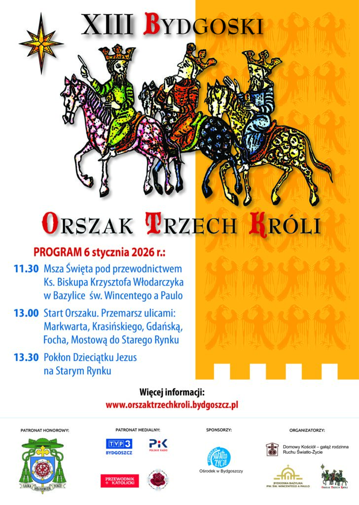 Organizatorzy Bydgoskiego Orszaku Trzech Króli zapraszają chętne rodziny lub grupy działające przy Parafiach do współtworzenia Bydgoskiego Orszaku Trzech Króli, który 6 stycznia 2026 roku przejdzie ulicami Bydgoszczy.