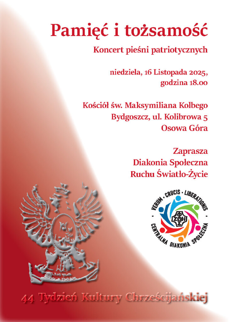 Z okazji Narodowego Święta Niepodległości Diakonia Społeczna serdecznie zaprasza na wspólne śpiewanie pieśni patriotycznych w par. Św. O. Maksymiliana, 16.11. w niedzielę o godz. 18.00. Zaśpiewajmy wspólnie dla Niepodległej!
